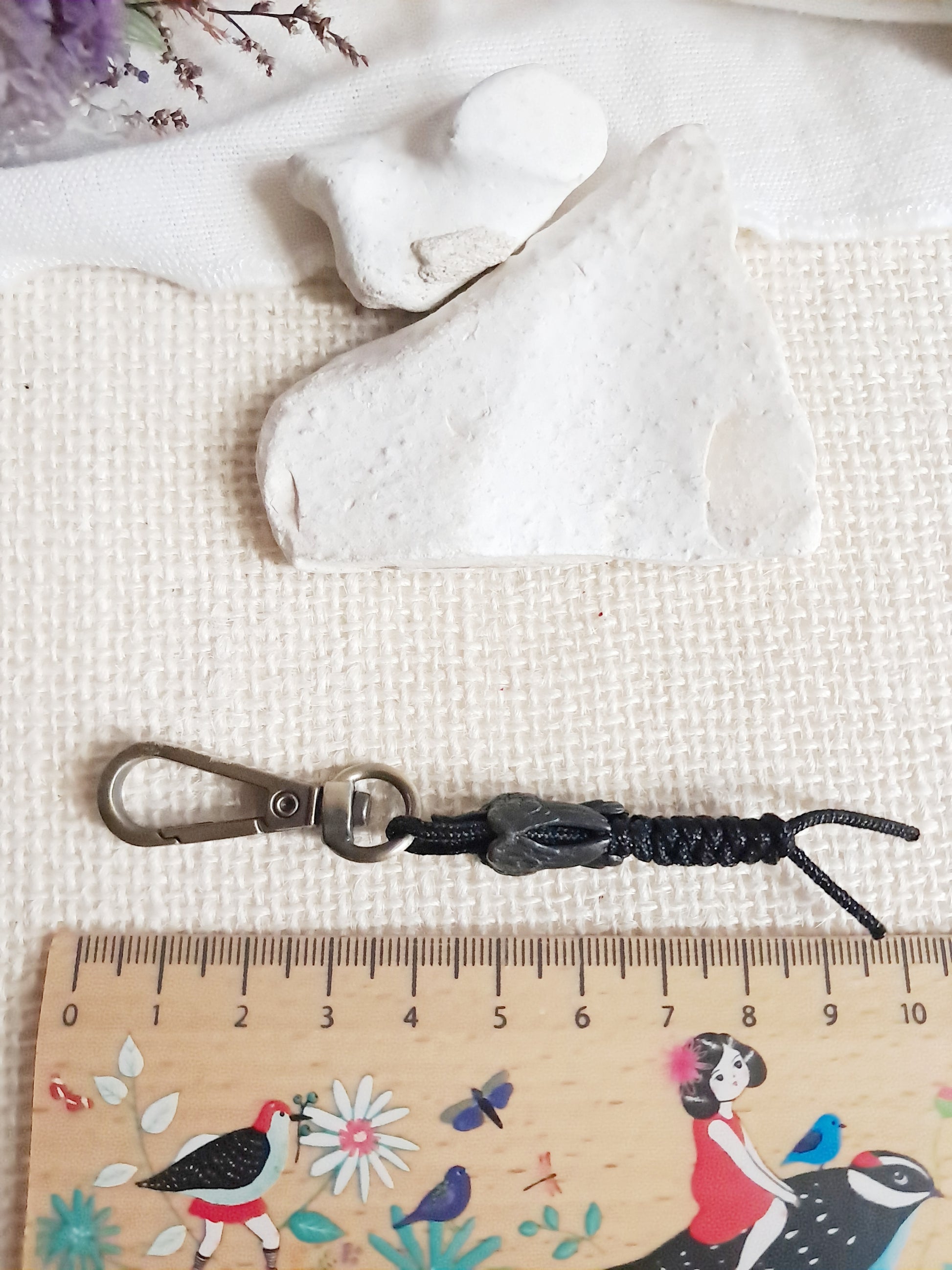 Ce porte-clés est fait d'une perle en laiton avec un tissage en fil de paracorde. La perle est en forme de corbeau.