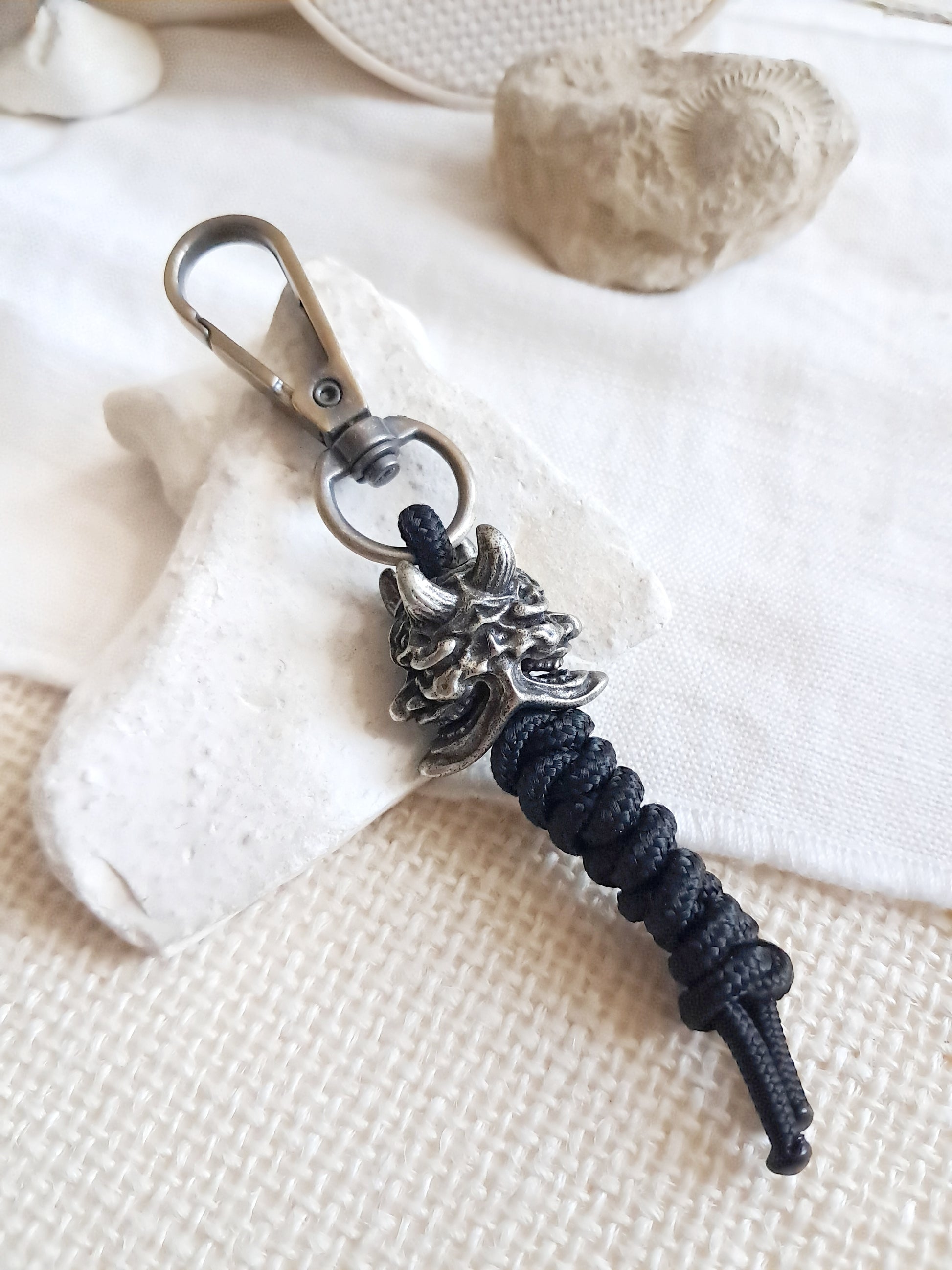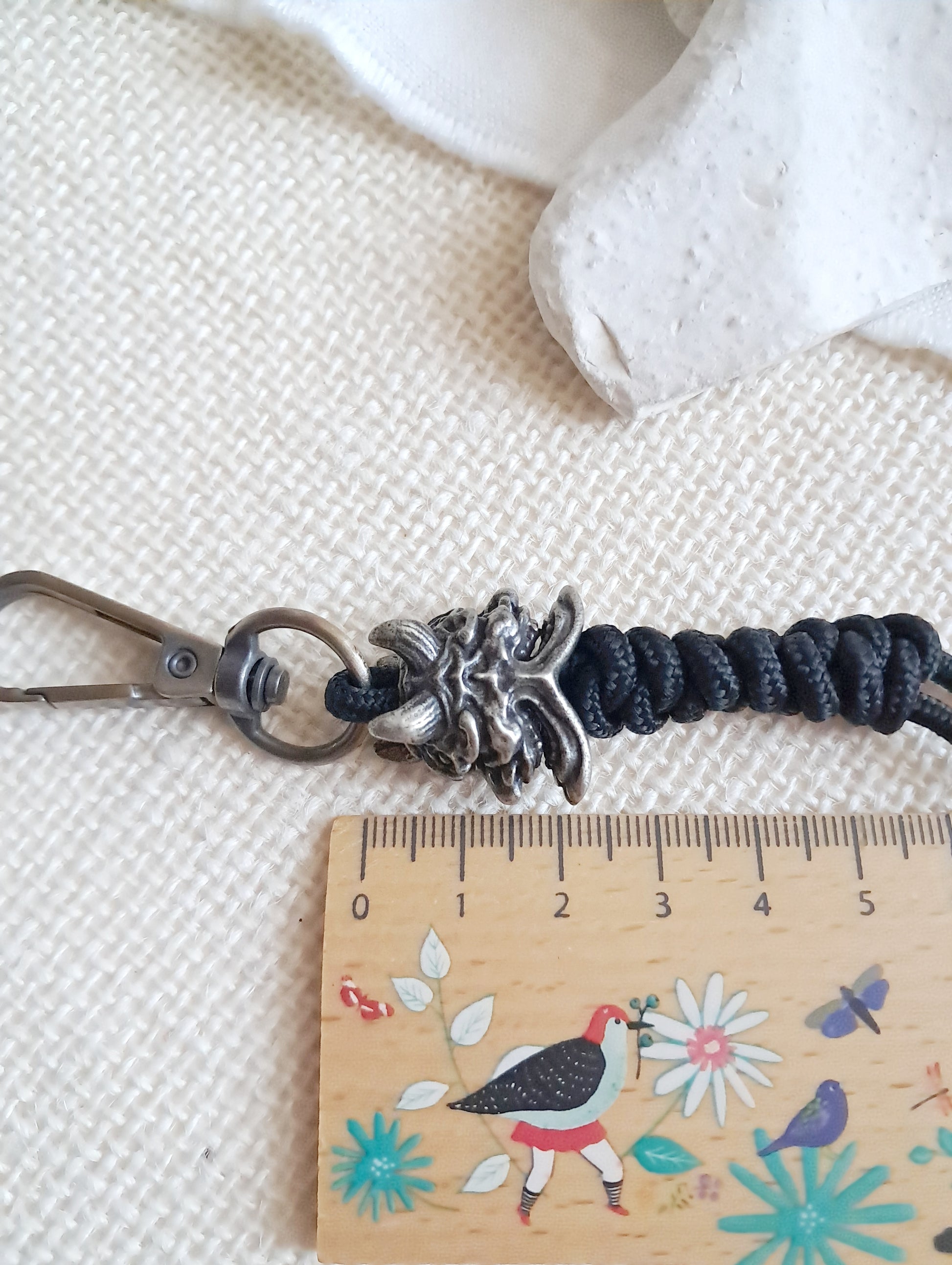 Ce porte-clés masque est fait avec une perle en laiton et un tissage en fil de paracorde.
