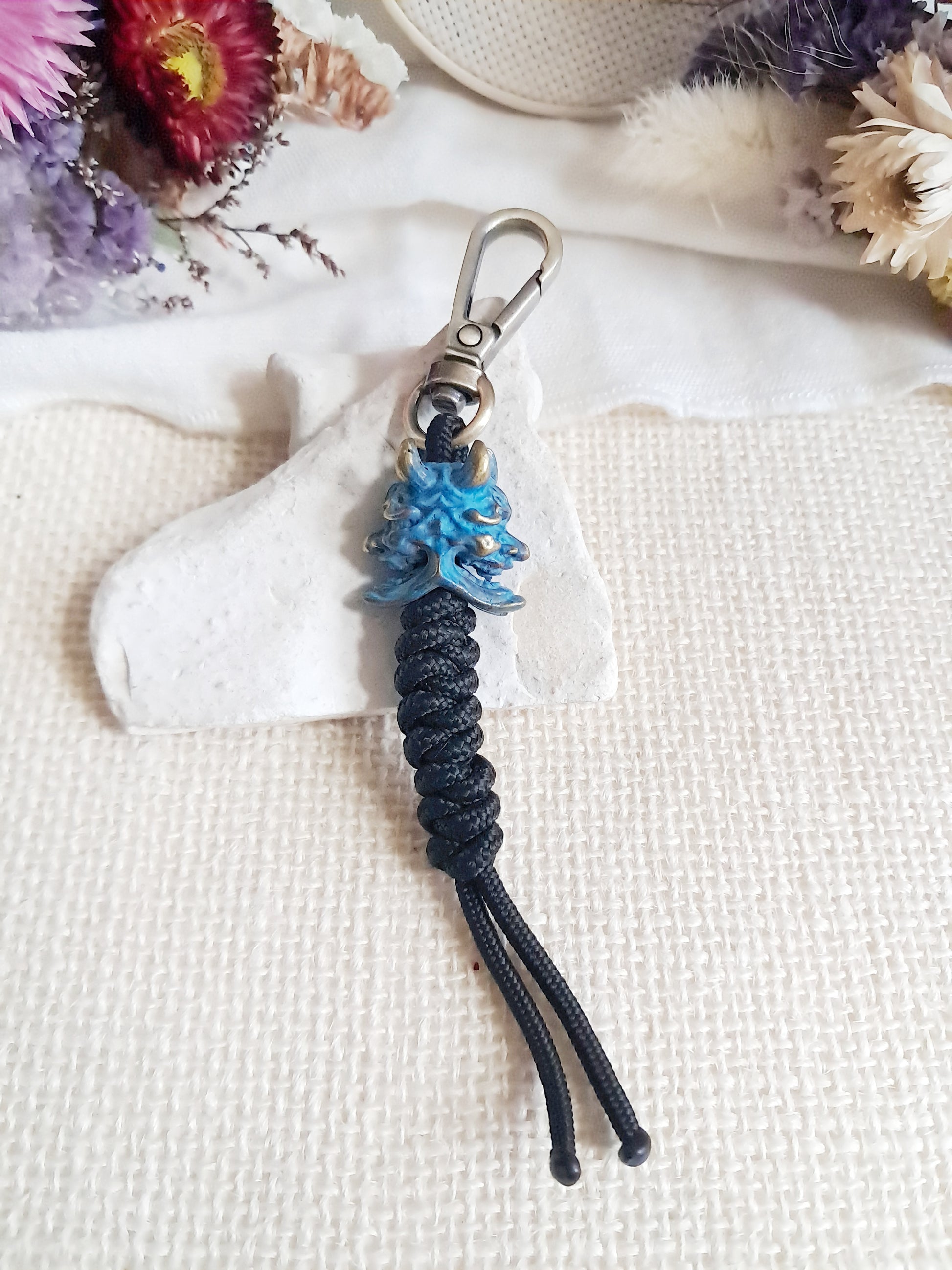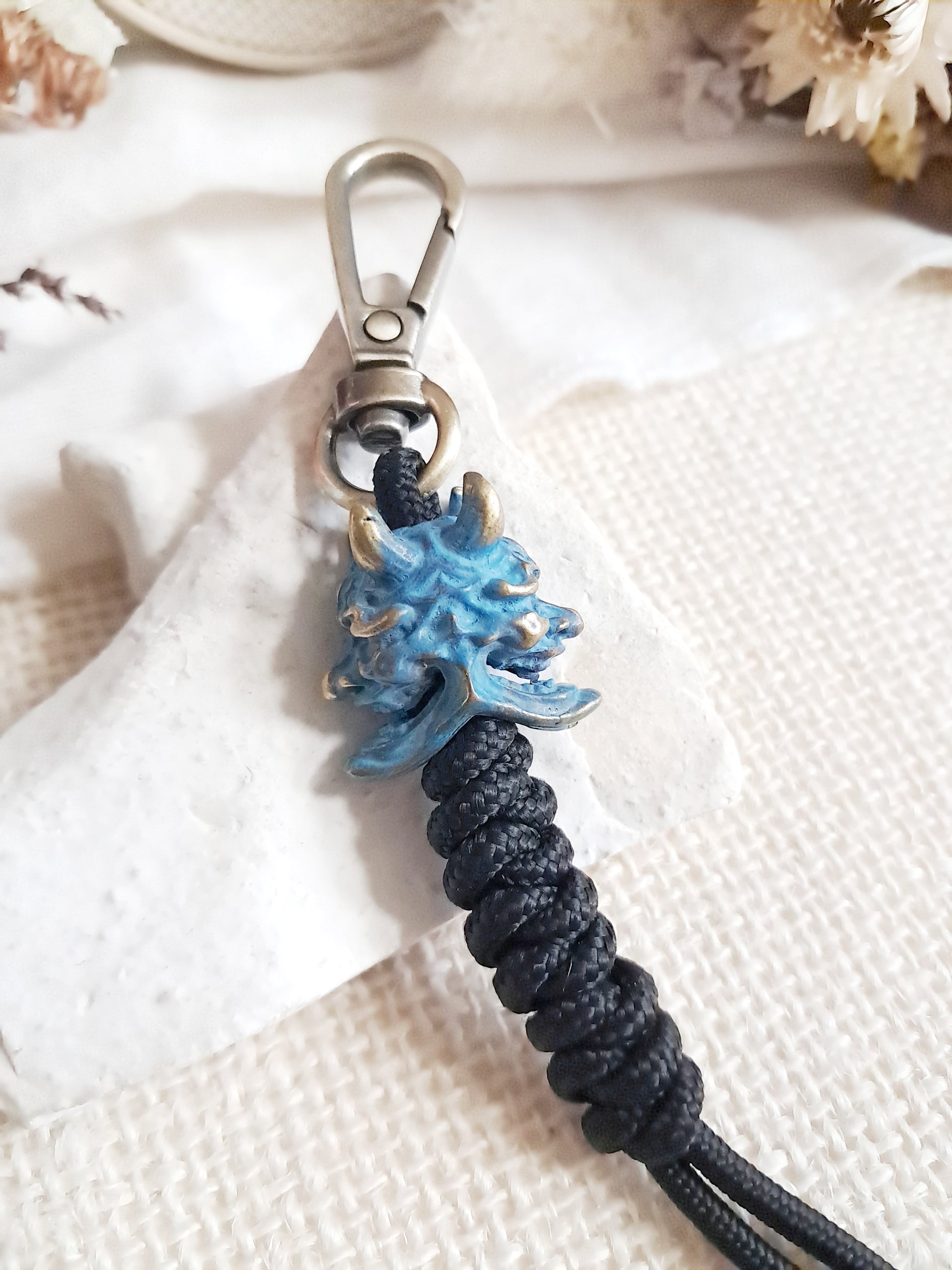Ce porte-clés masque est fait avec une perle en laiton et un tissage en fil de paracorde.