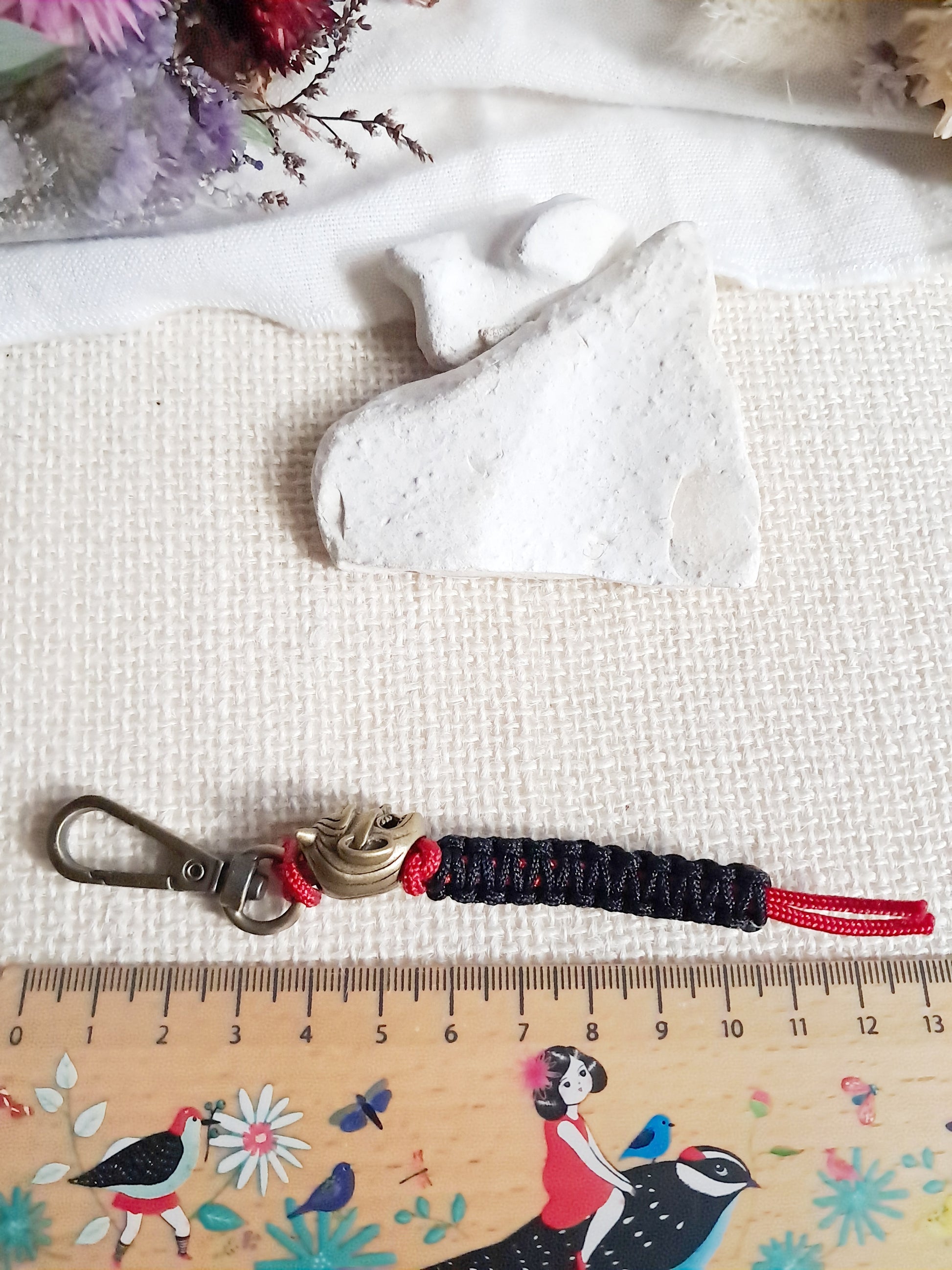 Ce porte-clés masque est fait avec une perle en laiton et un tissage en fil de paracorde bicolore.