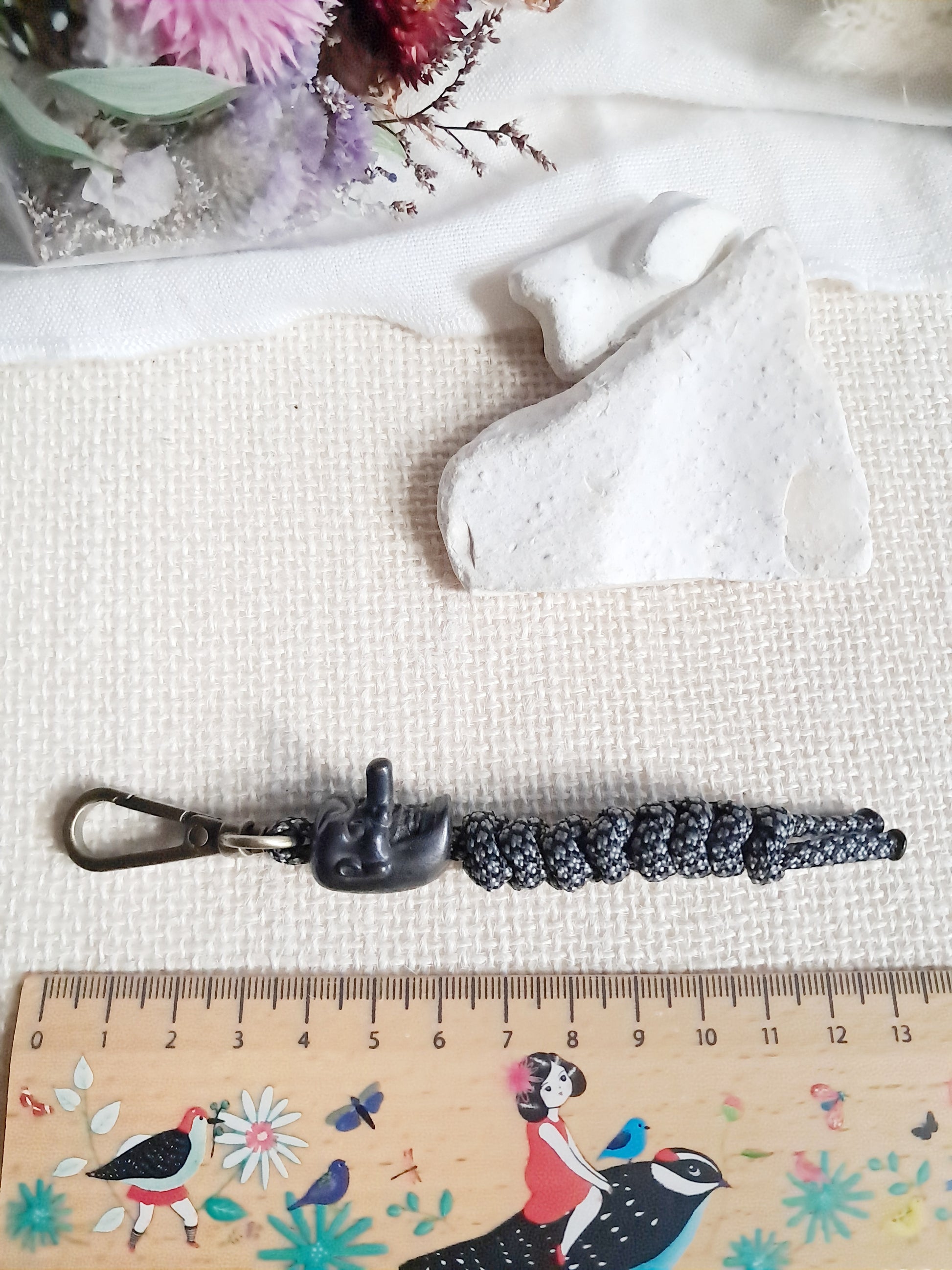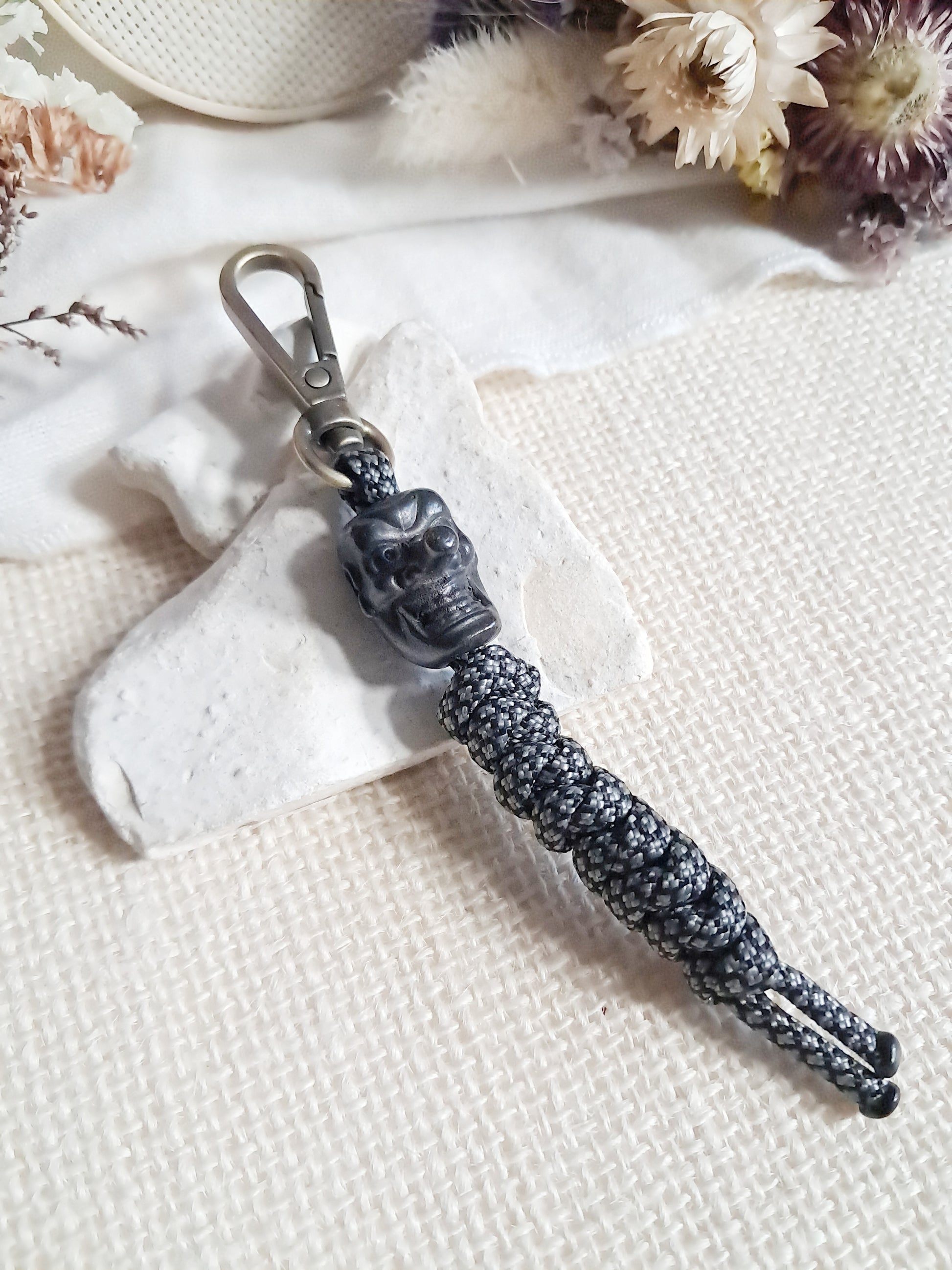 Ce porte-clés masque est fait avec une perle en laiton et un tissage en fil de paracorde.